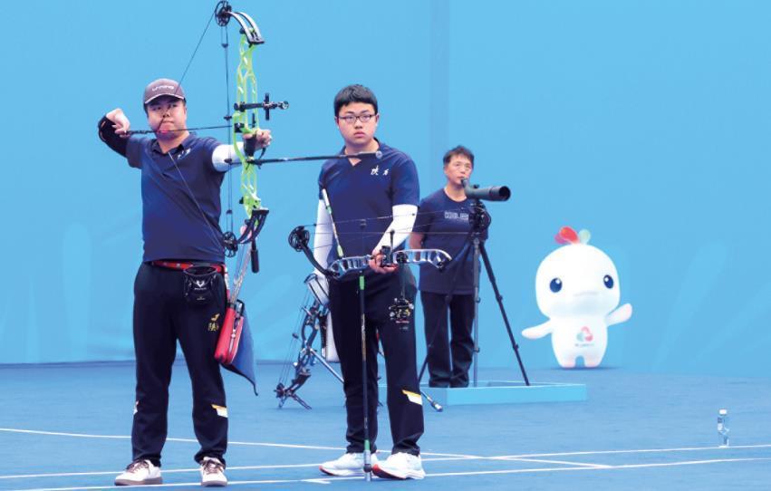 12月3日,陕西运动员冉鑫鑫、张益铖(左)在全国残特奥会射箭男子复合弓公开级团体淘汰赛比赛中。